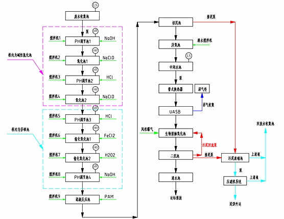 污水先PH調節池,然后在經過氧化池,這樣來回的重復幾個流程,在進入PAM反應池,然后經過沉淀,使排放出去的水能夠達標。其具體的流程圖如下。